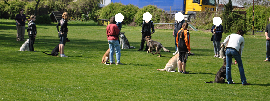 Saturday I went to the club to train the dogs. It's been actually a while that I went there with my old ones. I didn't go there all winter and returned when I got Indra. I wanted Yukon to fully recover from all his fears, went to different Clubs, checked out how they worked, went on the tracking Seminar and mainly worked for myself and taught him funny tricks. He had to get rid of most of his fears. Whenever I raised my voice, he ducked. Whenever I said "Platz" (down) he would not only duck but literally fall apart. He was so scared that I'd do something bad to him. He had to get more secure around other dogs. I wanted him to play more, to be able to walk in a group of people without jumping and socialize him more.
